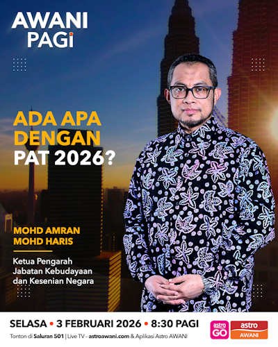 Diskusi #AwaniPagi Selasa bersama Ketua Pengarah Jabatan Kebudayaan dan Kesenian Negara, Mohd Amran Mohd Haris, berkongsi mengenai program disokong Kementerian Pelancongan Seni dan Budaya (MOTAC) iaitu Pesta Angin Timur Perlis (PAT) 2026 yang diinspirasi daripada fenomena Angin Timur, satu keunikan alam yang sinonim dengan negeri Perlis.